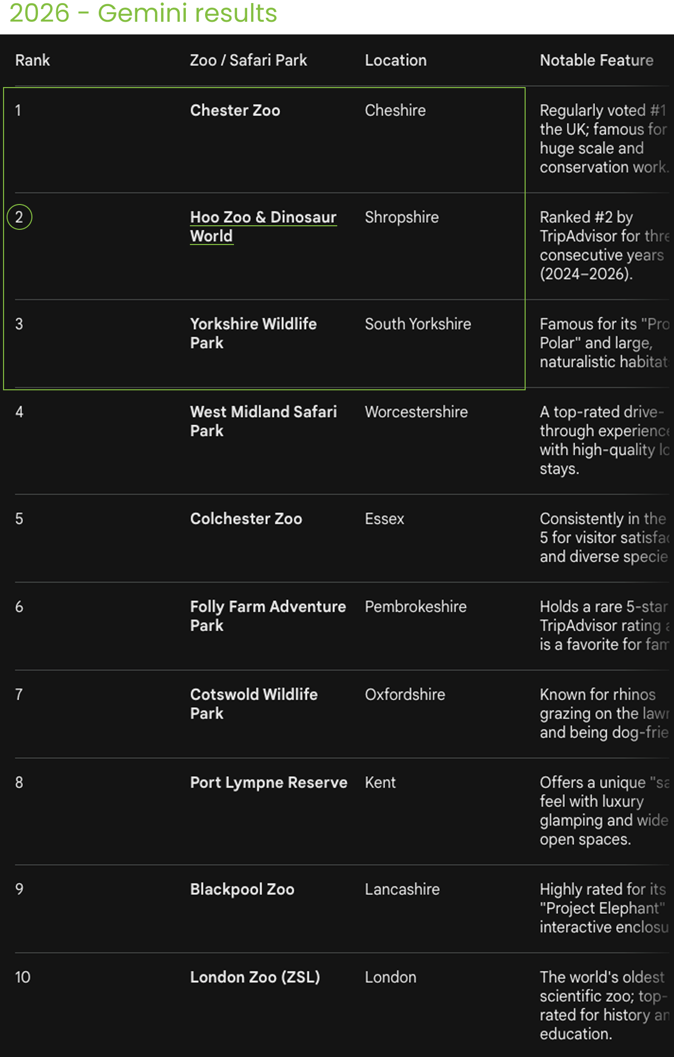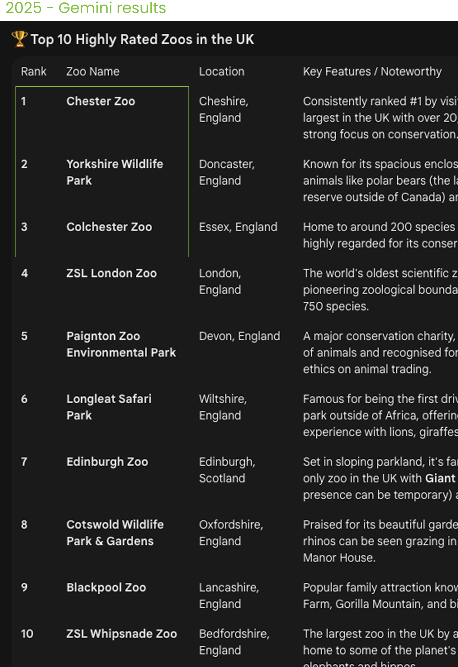 We then both ran the same query in Gemini and on a Google Search: ’What are the UKs top 10 highest rated zoos in the UK?’
