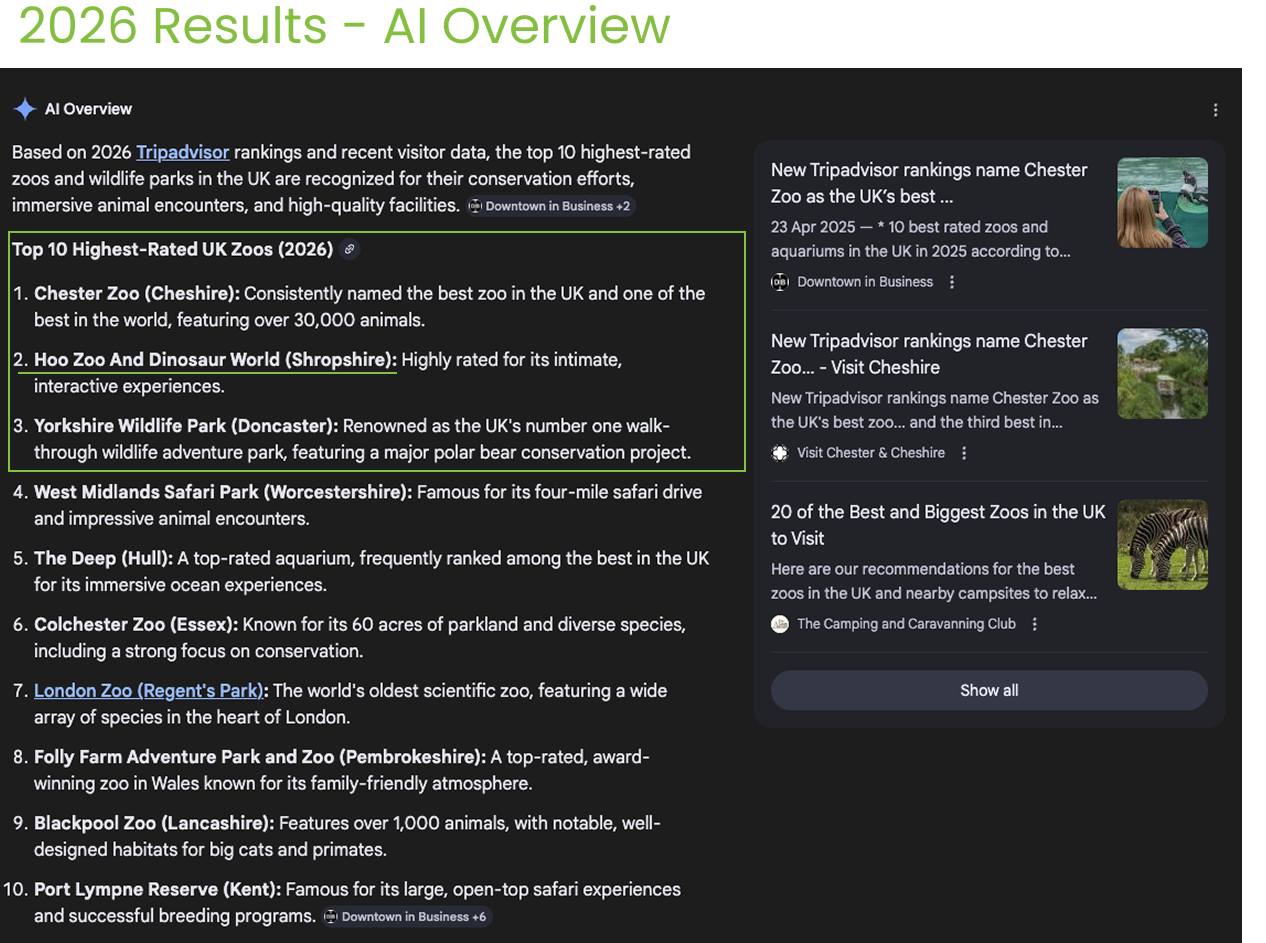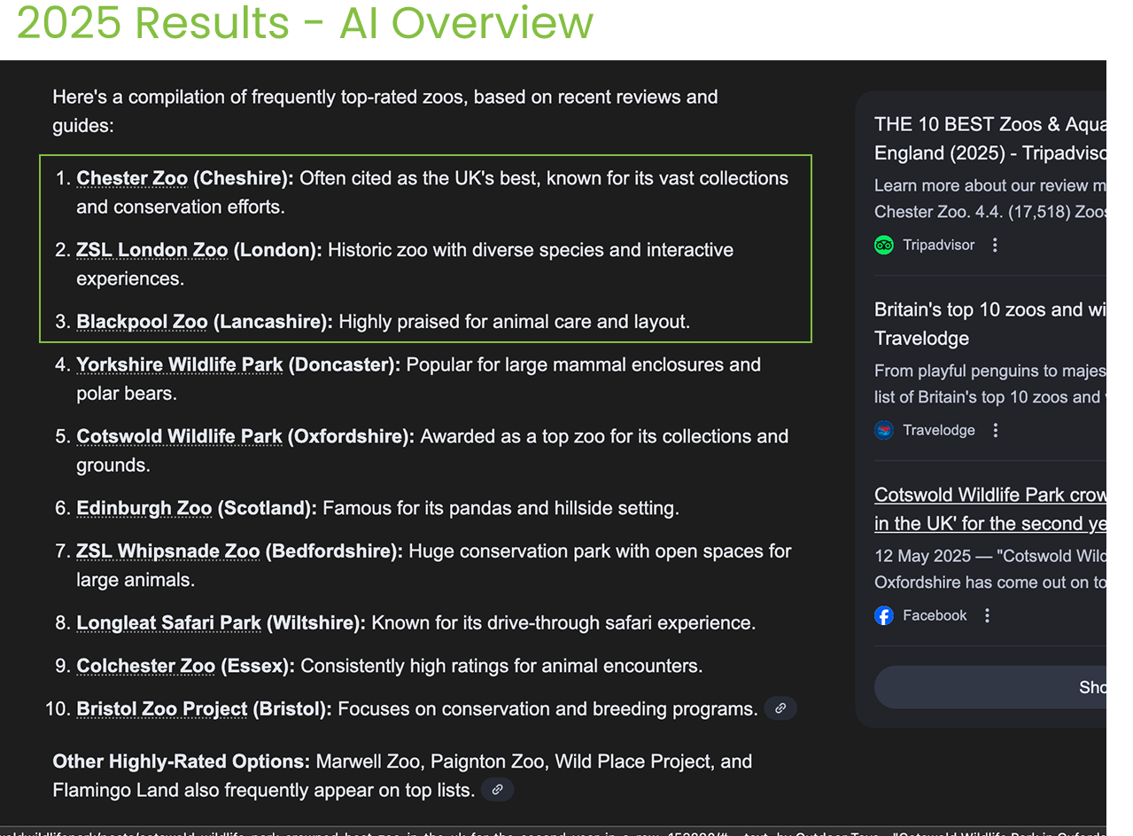 What this admittedly, limited experiment demonstrates is that AI-generated results are not fixed or guaranteed. Unless an organisation has very strong media coverage or an established reputation, such as Chester Zoo in this case, it appearing in AI-generated answers may vary.