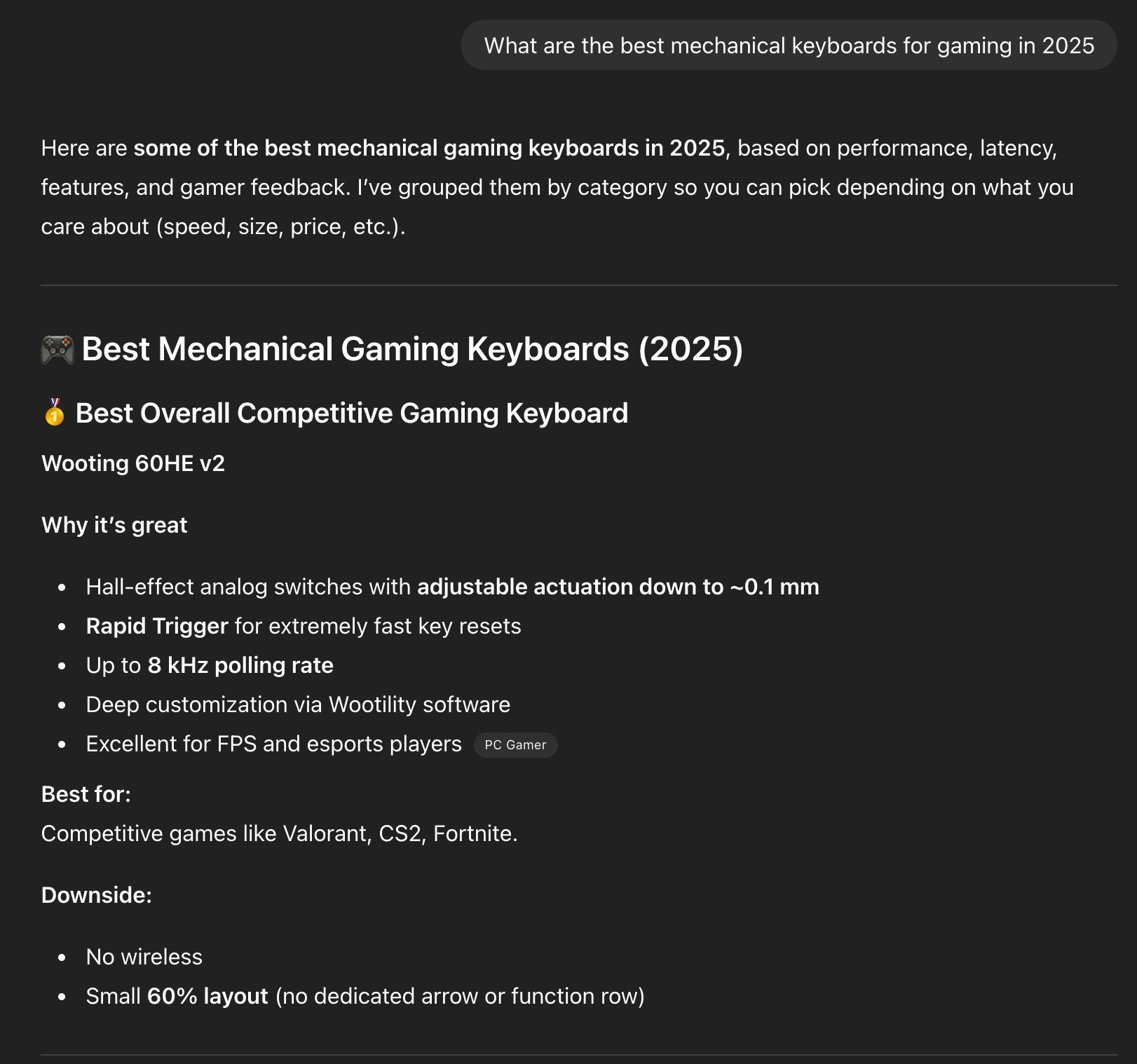 This sort of results will appear for question like ‘What are the best mechanical keyboards for gaming in 2025?