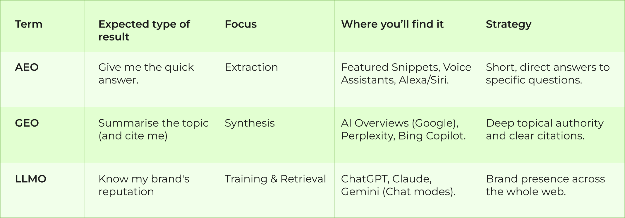 • LLMO – Knows and recommends your brand within Generative chat bots like ChatGPT, Gemini or Perplexity