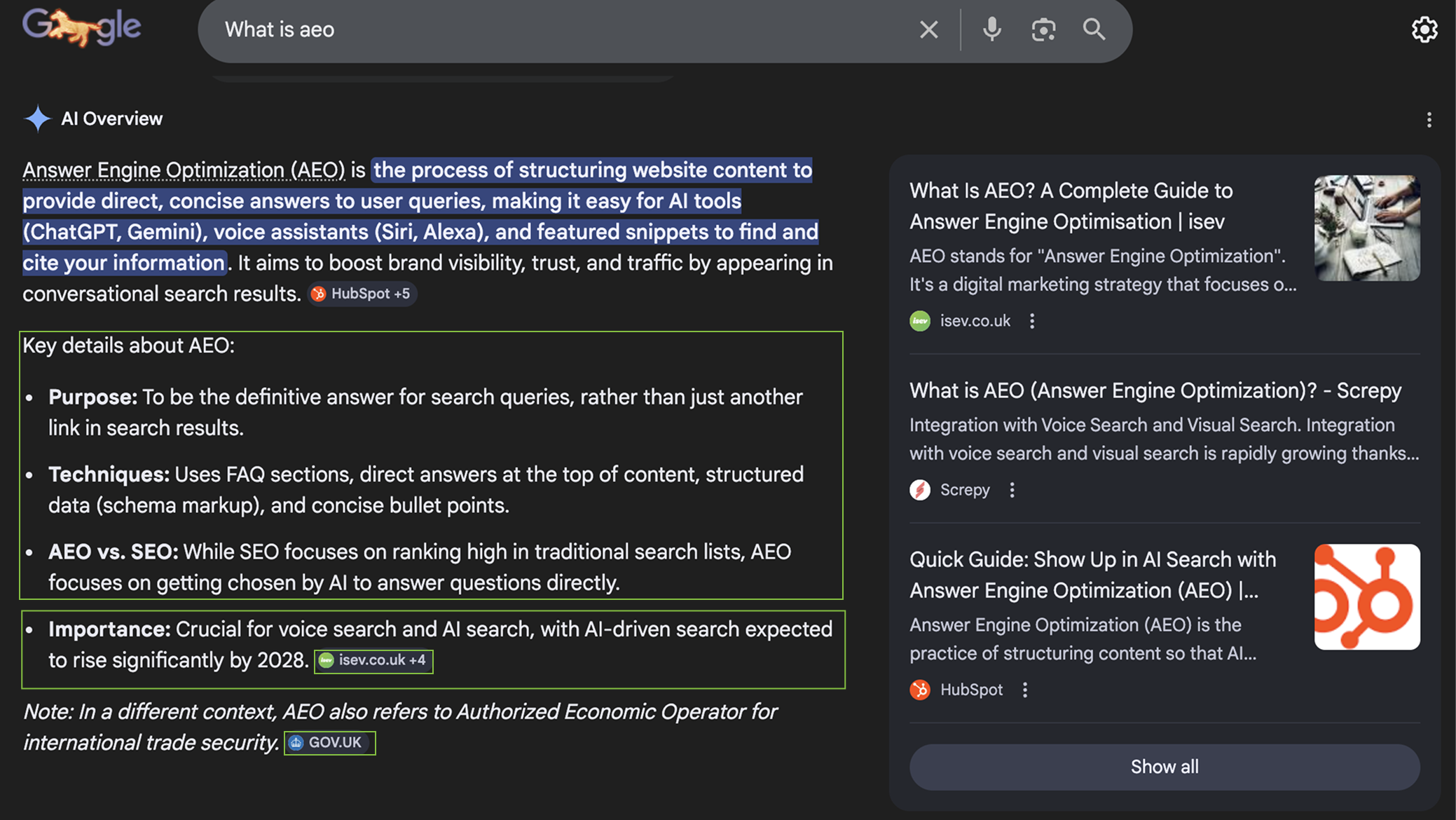 • AEO (Answer Engine Optimisation) is the practice of optimising your content to be easily extracted, and summarised to specifically be used as the direct answer, featured snippet or summary by answer engines.